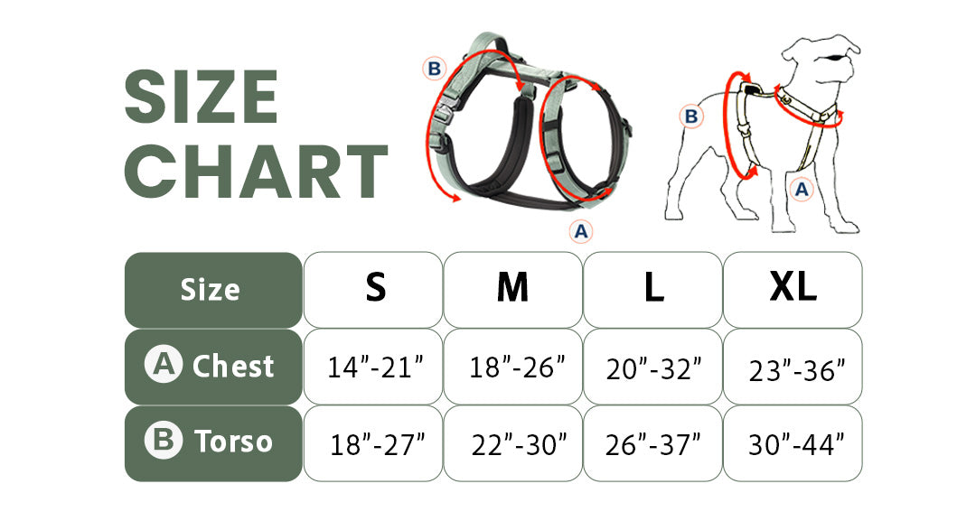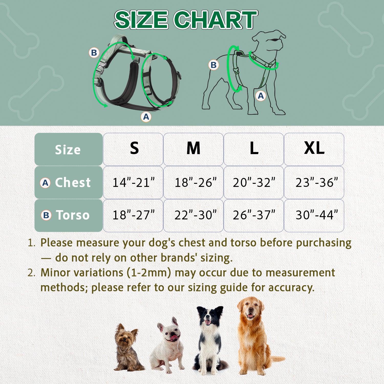 Please measure your dog's chest and torso before purchasing our dog harness —— do not rely on other brand's sizing.